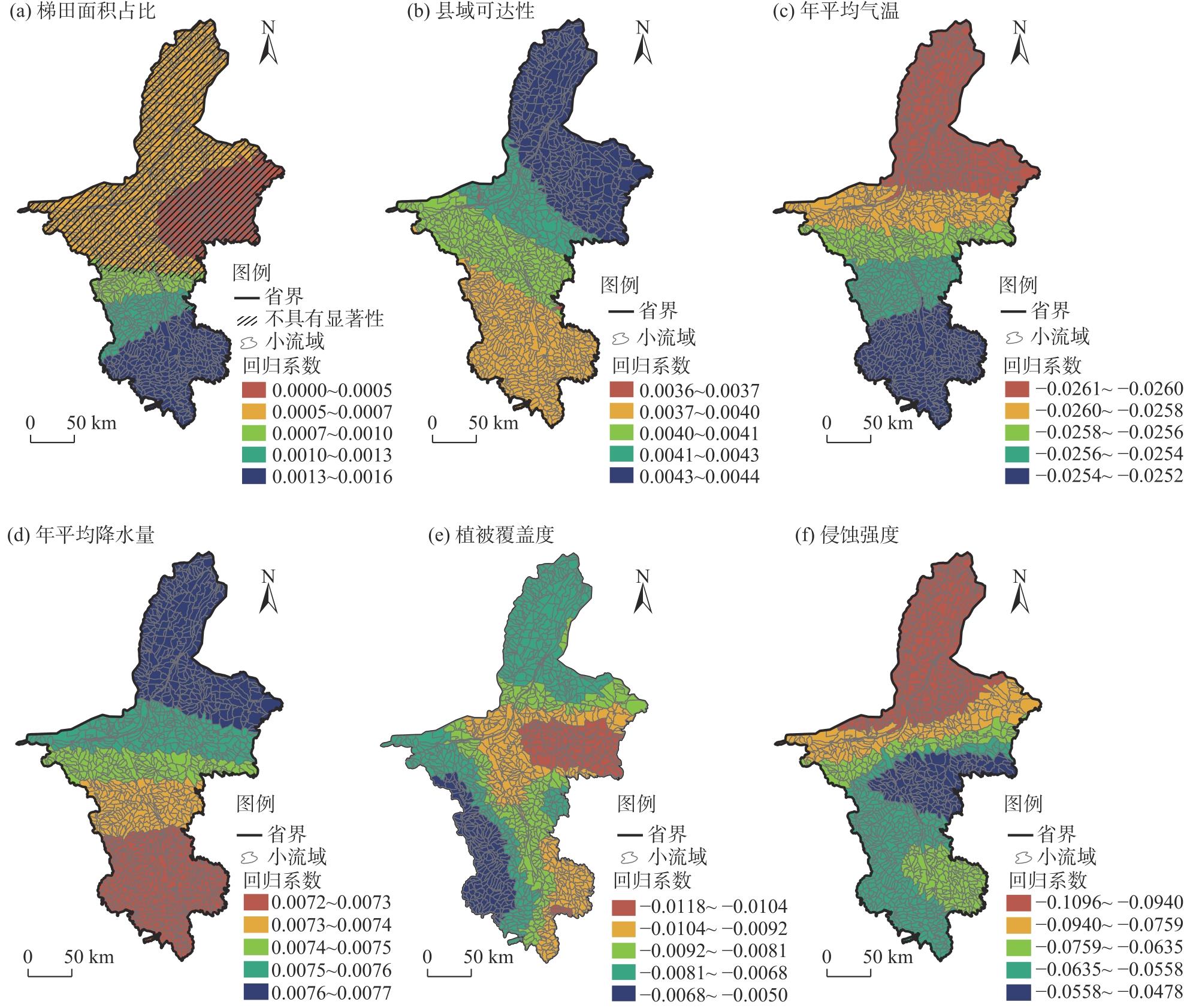 水土资源的耦合协调对于小流域生态系统服务功能的可持续发展具有重要意义。以宁夏小流域为研究单元,采用耦合协调度模型对研究区水土资源耦合协调度进行测度,并采用多尺度地理加权回归模型探究了水土资源耦合协调度的影响因素及空间异质性。 结果表明:(1) 2005—2020年宁夏小流域水土资源耦合协调度从0.37上升到0.43,区域水土资源匹配程度从失调向协调方向发展。(2) 宁夏小流域水土资源耦合协调度呈现出南高北低的空间格局,且2000—2020年南部小流域水土资源耦合协调度的高值区向周边扩展。(3) 宁夏小流域的梯田面积占比、县域可达性和年平均降水量对水土资源耦合协调度会产生显著的正向影响,而年平均气温、植被覆盖度和侵蚀强度对小流域的水土资源耦合协调度会起到显著负向影响;相较于宁夏北部小流域,小流域梯田面积占比和年平均气温对宁夏南部小流域的水土资源耦合协调度影响较大,而县域可达性和年平均降水量对宁夏南部小流域水土资源耦合协调度影响较小。研究结果可为宁夏小流域尺度水土保持措施的科学规划提供参考。