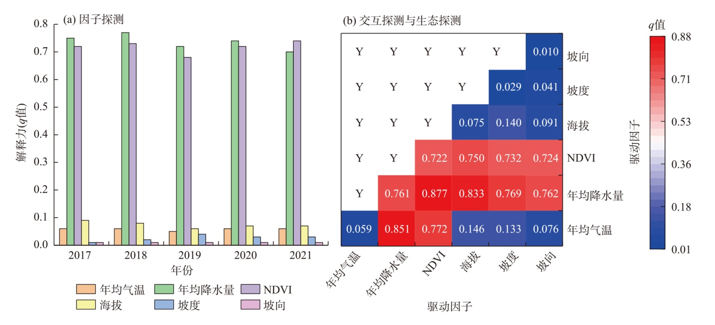 摘要: 土壤水分对植被生长和陆地生态系统至关重要,特别是对干旱半干旱区山地森林生态系统服务供给起着决定性作用。采用遥感土壤水分数据,基于趋势分析和相关性分析、地理探测器等方法探究了2017—2021年祁连山地区土壤水分的时间动态及其空间分异特征,围绕年均气温、年均降水量、归一化植被指数(Normalized difference vegetation index,NDVI)、坡度、坡向、海拔对土壤水分时空分异的影响进行了分析。结果表明:(1)2017—2021年祁连山地区土壤水分变化相对稳定(趋势斜率为0.000018),但年际波动较大(变异系数为0.183)。(2)生长季(5—10月)土壤水分在空间分布上具有显著差异性(0.068~0.214),受东亚季风的影响,土壤水分整体呈现出东高西低的趋势。(3)相关分析和地理探测器的结果均表明,降水量和NDVI对土壤水分时空变化起主导作用,解释力(q)分别为0.761和0.722,均在70%以上,而地形因素影响较小,q值不足0.1。各环境因子对祁连山土壤水分空间分布的影响具有显著性差异,并具有交互作用,呈现双因子增强和非线性增强关系。研究结果可为祁连山地区生态保护政策和措施的制定提供科学依据,促进该地区的生态环境保护。