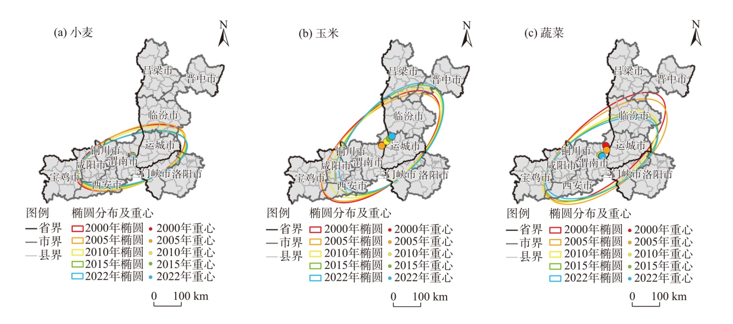 Food security is fundamental to national development and social stability. The analysis of the spatiotemporal evolution of crop planting structures provides a theoretical basis for ensuring regional food security and promoting the sustainable development of agriculture. This study examines the crop planting structure across 117 counties (cities/districts) in the Fenwei Plain, Shanxi Province and Shaanxi Province, China based on agricultural statistical data for the period of 2000—2022. Employing methods such as the standard deviation ellipse model and spatial autocorrelation analysis, the spatial and temporal dynamics of major crop planting structures over this period are explored. The results indicate the following. (1) Over the study period, 88 distinct crop planting structure types were identified, with wheat, corn, and their combinations (wheat type, corn type, wheat-corn type, and corn-wheat type) being the dominant types. Moreover, spatially and temporally, the number of wheat-type counties gradually declined, while the number of corn-type counties steadily increased. Wheat-corn-type counties expanded from the southwest to the northeast of the Fenwei Plain, while corn and wheat varieties were dispersed throughout the region. Crop planting structure diversity peaked in 2005, whereas the richness index was lowest in 2015. (2) For the period of 2000—2022, the planting patterns of wheat, corn, and vegetables exhibited a distribution trend along the northeast-southwest axis. The center of gravity for wheat remained stable, whereas that of corn shifted progressively northeastward. Meanwhile, the center of gravity for vegetables moved from Heyang County to Chengcheng County in a southwestward direction. Thus, the spatial distribution of major crops in the Fenwei Plain demonstrates a differentiated development trend, with a decline in wheat cultivation and expansion in corn and vegetable cultivation. To ensure food security, future adjustments to the crop planting structure of the Fenwei Plain should be made based on an analysis of these spatiotemporal trends and supported by macroeconomic regulatory measures.