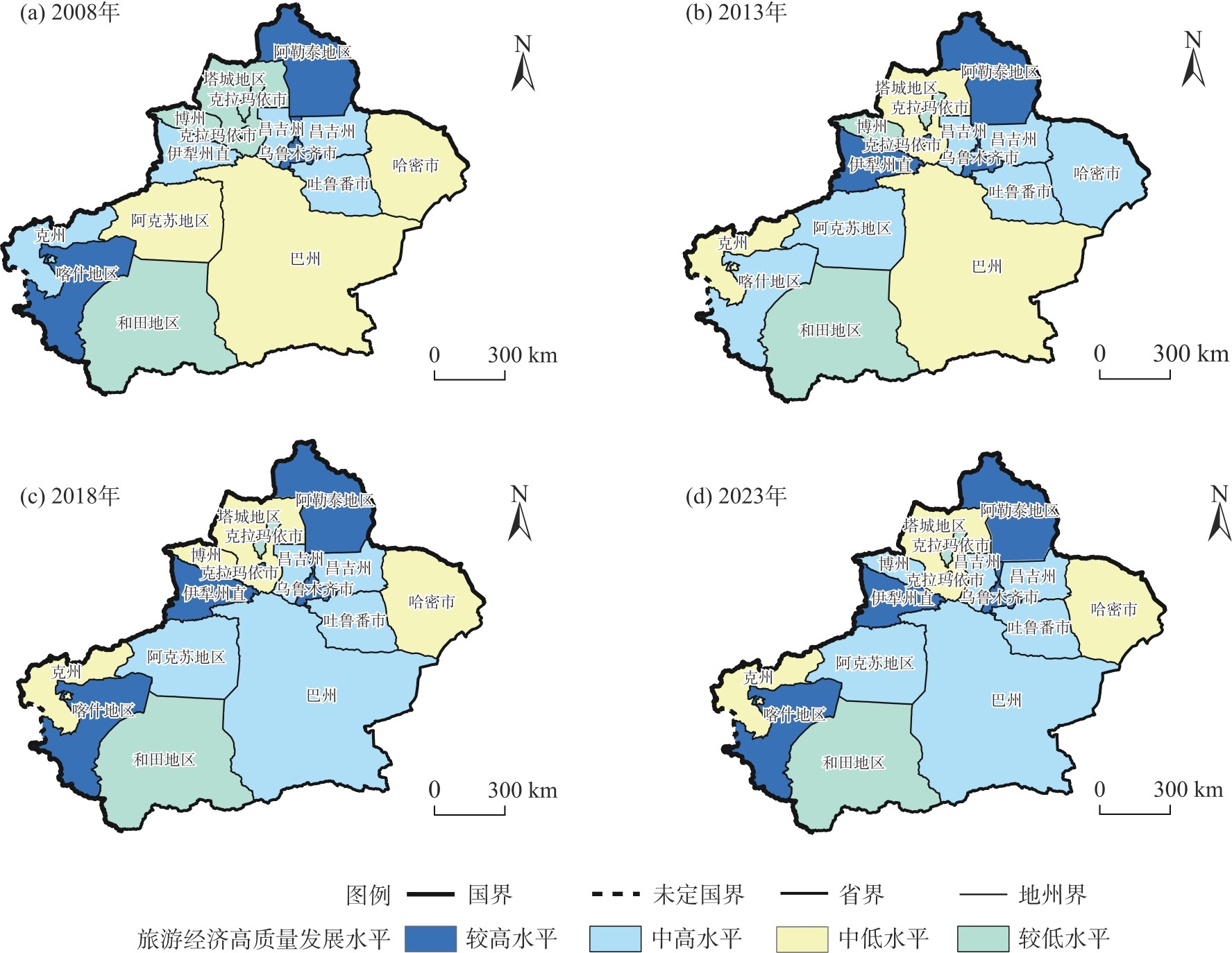 As the ninth largest industry cluster in Xinjiang, the high-quality development of the tourism economy plays a leading role in the region’s modernization in China. This study constructs a seven-dimensional measurement system to evaluate the high-quality development of the tourism economy based on three perspectives: quality, efficiency, and tourist experience. The level of high-quality development in Xinjiang’s tourism economy from 2008 to 2023 is measured, employing geographic information systems spatial visualization to analyze its spatial and temporal evolution characteristics. In addition, the study identifies obstacle sources using the obstacle degree model and explores influencing factors through factor analysis and gray correlation analysis. The results indicate the following. (1) The initial level of high-quality development of the tourism economy in Xinjiang is low, but it has improved rapidly since the introduction of the “tourism to develop Xinjiang” strategy in 2018. (2) Significant spatial and temporal differences in the level of high-quality development are observed within Xinjiang’s tourism economy. The overall trend shows strong development in the north and weaker development in the south, with the east and west exhibiting coherence. This is specifically reflected in the cities of Urumqi, the Ili Kazakh Autonomous Prefecture, the Altay Prefecture, and the Kashgar Prefecture, demonstrating a “four-wheel drive” evolution and a “core of three points” symbiotic development pattern. (3) The overall high-quality development of the tourism economy in Xinjiang is primarily constrained by regional innovation capacity. Regions with lower levels of high-quality development face challenges due to a lack of tourism market attractiveness and underdeveloped cultural and tourism resources. (4) Key factors affecting the high-quality development of Xinjiang’s tourism economy include information services, economic support, and tourism transportation, whereas resource elements and tourism services are considered secondary factors. Notably, factors such as increased Internet accessibility, rising disposable incomes, higher fixed-asset investment in the tertiary industry, and expanded highway infrastructure significantly affect the high-quality development of Xinjiang’s tourism economy.