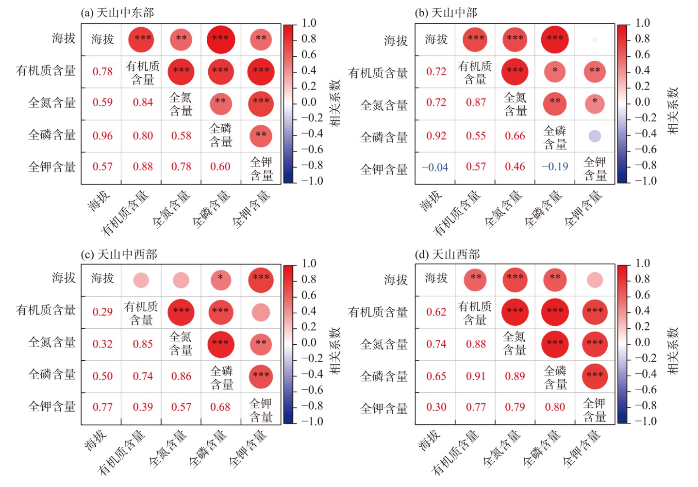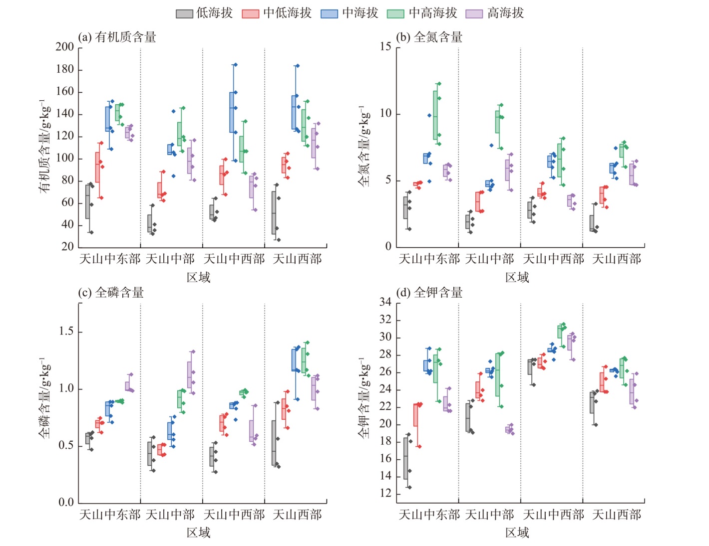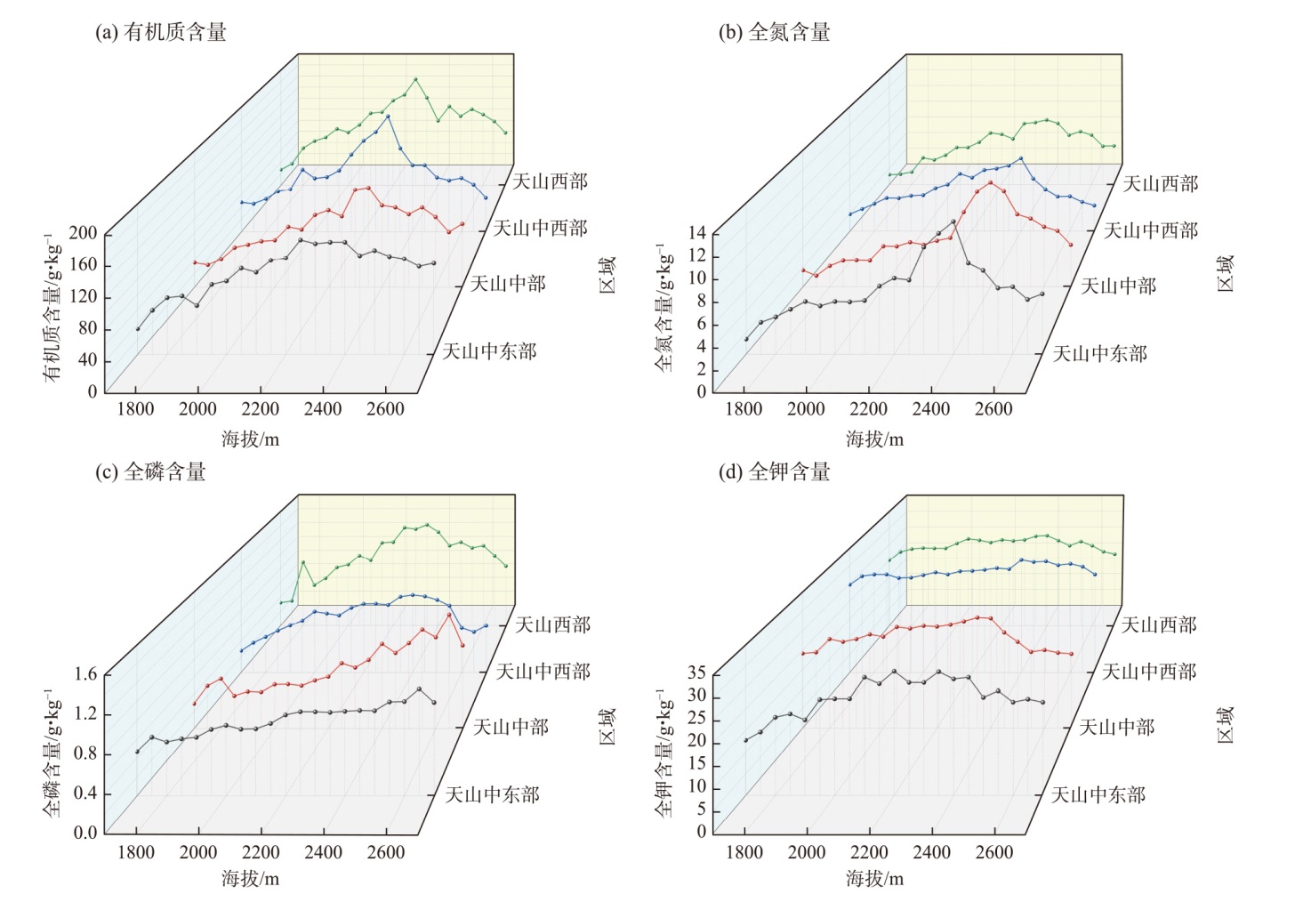 | 海拔 | 有机质含量 | 全氮含量 | 全磷含量 | 全钾含量 |