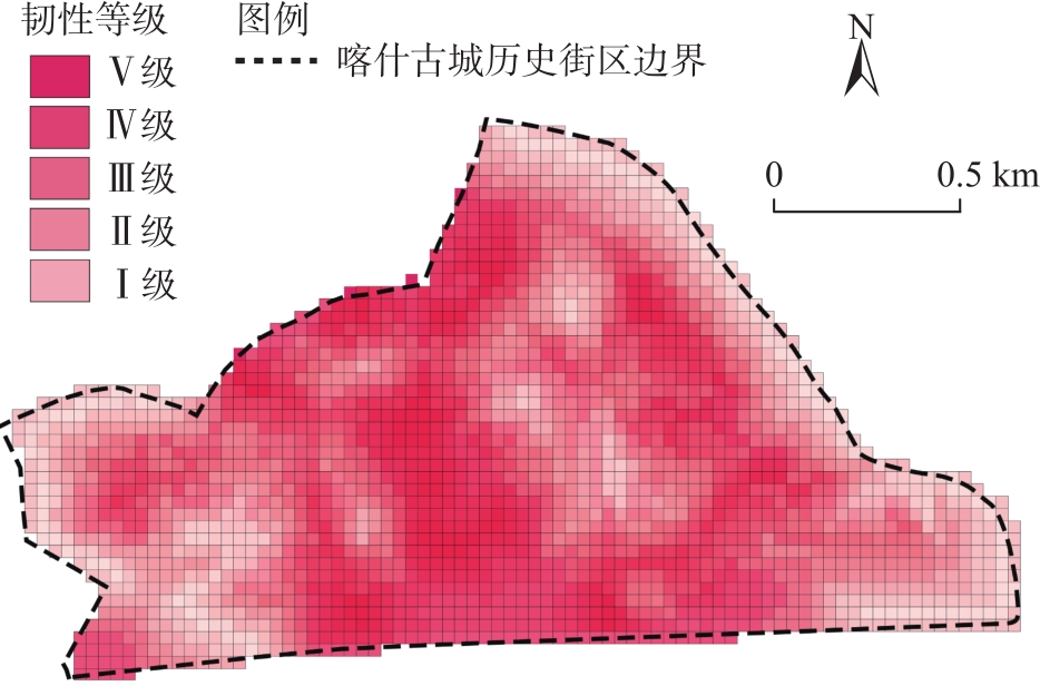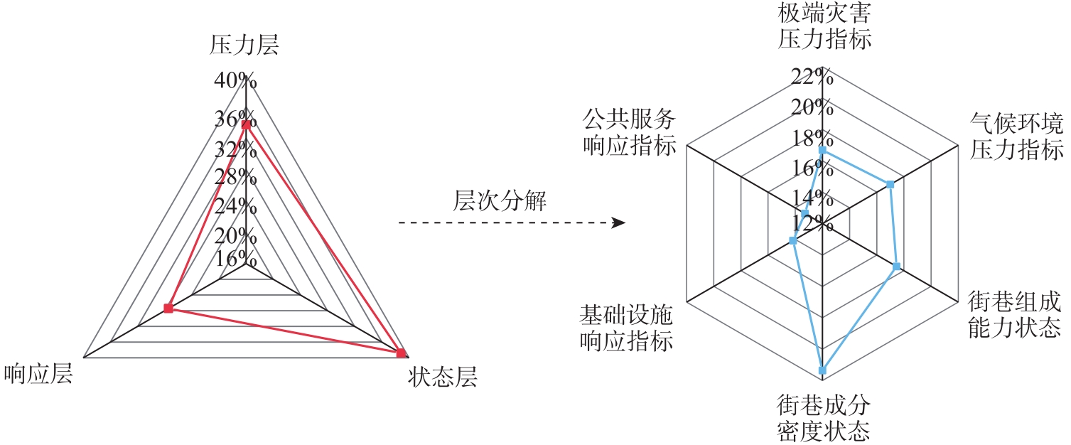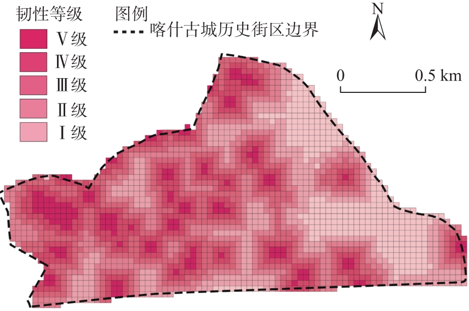 In the overall national security concept in the new era, historical blocks are facing dual challenges of disturbances and resilience building. Taking the historical block of Kashi Old City as the research object, this studybuilds a pressure-state-response model comprising six elements: Extreme disaster pressure, climate environment pressure, alley composition capacity, alley component density, infrastructure response, and public service response. It selects 44 key factors closely related to resilience to natural disturbances and uses the entropy weight method and the analytic hierarchy process to establish a multidimensional resilience evaluation system for historical blocks. The evaluation results show that (1) The comprehensive resilience index of the historical block of Kashi Old City is 1.84 (Level II), and the overall coping ability is weak. The resilience of the state layer (38.83%) is significantly higher than that of the response layer (27.45%), indicating its strong self-regulating ability but weak postdisaster management. (2) The key restrictive factors are the flood inundation radius, historical street and alley greening rate, and average summer solar radiation intensity, highlighting the synergistic risks between high-density built environments and climate sensitivity. (3) The wisdom of traditional construction is not linked to modern disaster prevention needs, leading to a contradiction between protection and safety. The results reveal a quantitative framework for integrated multi-hazard defense and living conservation of historic districts in arid zones, thereby promoting the synergistic development of cultural heritage conservation and ecological security.