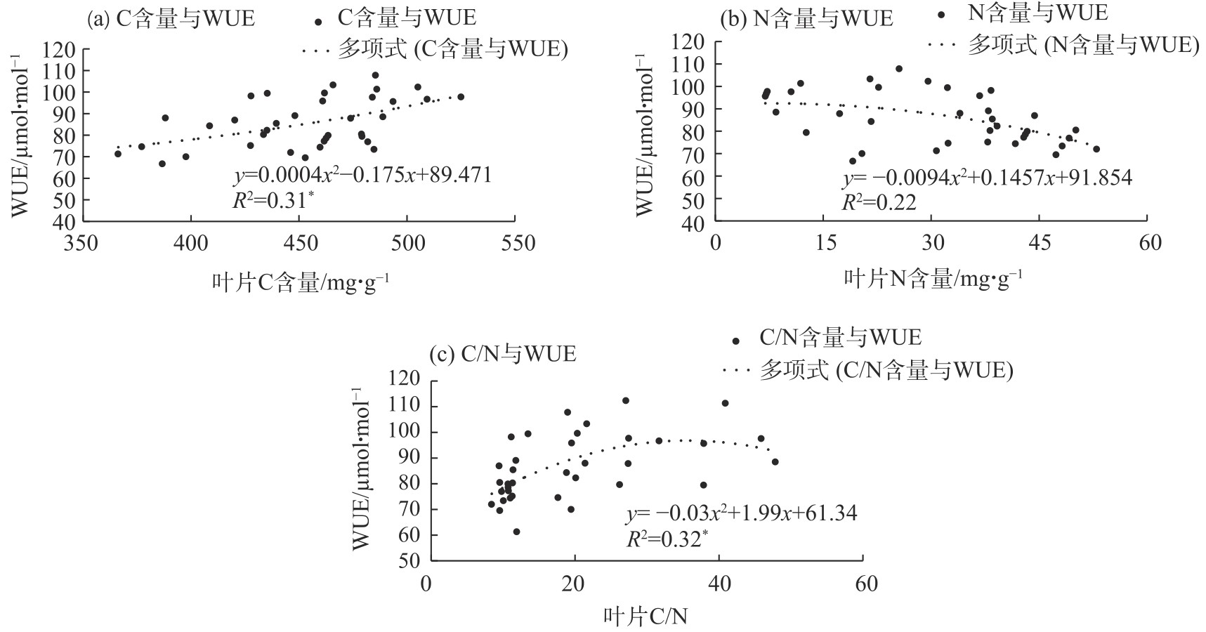 Plant water-use efficiency (WUE), which measures the balance between carbon assimilation and water transpiration, serves as a vital indicator of how plants adapt to environmental constraints. This study investigated the dynamics of leaf WUE in pioneer tree species within a reclaimed ecosystem at the Pingshuo open-pit coal mine of Shanxi Province, a representative site in the loess hilly region of China. We focused on three dominant pioneer species: Pinus tabuliformis, Ulmus pumila, and Robinia pseudoacacia, across a chronosequence of reclamation ages (5, 15, 20, and 28 years). The study involved determining leaf carbon (C) and nitrogen (N) concentrations, C/N ratios, and long-term WUE as inferred from stable carbon isotope composition (δ13C). We also analyzed the relationship between leaf C/N stoichiometry and WUE. The results revealed the following. (1) Leaf C and N concentrations in R. pseudoacacia and U. pumila generally increased with reclamation age, whereas P. tabuliformis peaked in C and N levels at 15 and 20 years, respectively. P. tabuliformis had a significantly higher leaf C concentration and C/N ratio compared to U. pumila (P<0.05) but a lower N concentration compared to the other two tree species (P<0.05). R. pseudoacacia maintained the highest leaf N concentration among the species (P<0.05). (2) Intra-specific WUE varied significantly (P<0.05) with reclamation age: P. tabuliformis had the highest WUE at five years and the lowest at 28 years; U. pumila peaked at 28 years and was at its minimum at five years; R. pseudoacacia reached its maximum WUE at 15 years and minimum at five years. Inter-specifically, P. tabuliformis consistently exhibited higher WUE than both U. pumila and R. pseudoacacia. (3) Across all three species, leaf WUE showed significant positive correlations with leaf C concentration and C/N ratio, whereas its correlation with leaf N concentration was insignificant. These findings elucidate the species-specific WUE characteristics and adaptive physiological adjustments of pioneer trees during vegetation succession in the Pingshuo reclaimed mine area, offering a theoretical foundation for vegetation restoration efforts in open-pit coal mines within the loess hilly region.
